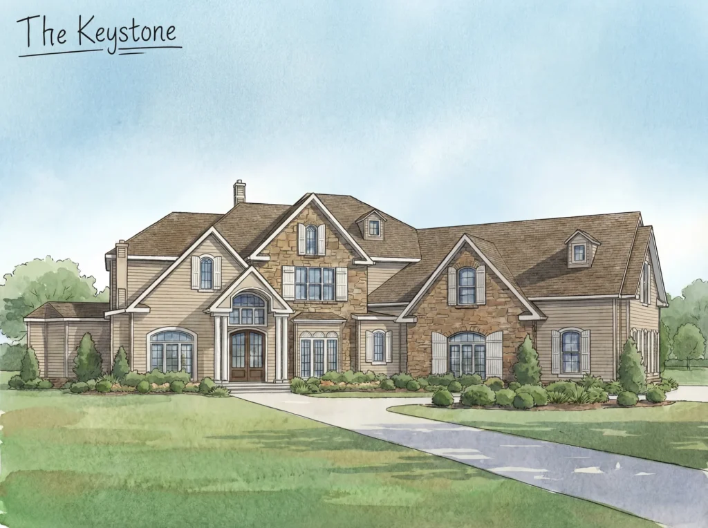 The Keystone presents 3,937 sq ft of refined living space. An impressive spiral staircase creates a sophisticated focal point upon entry, leading into a gracious layout suited for both entertaining and daily life. This 4-bedroom, 4.5-bath residence features substantial living areas and detailed craftsmanship throughout. With its timeless stone exterior and classic architectural lines, this estate offers enduring quality and style.